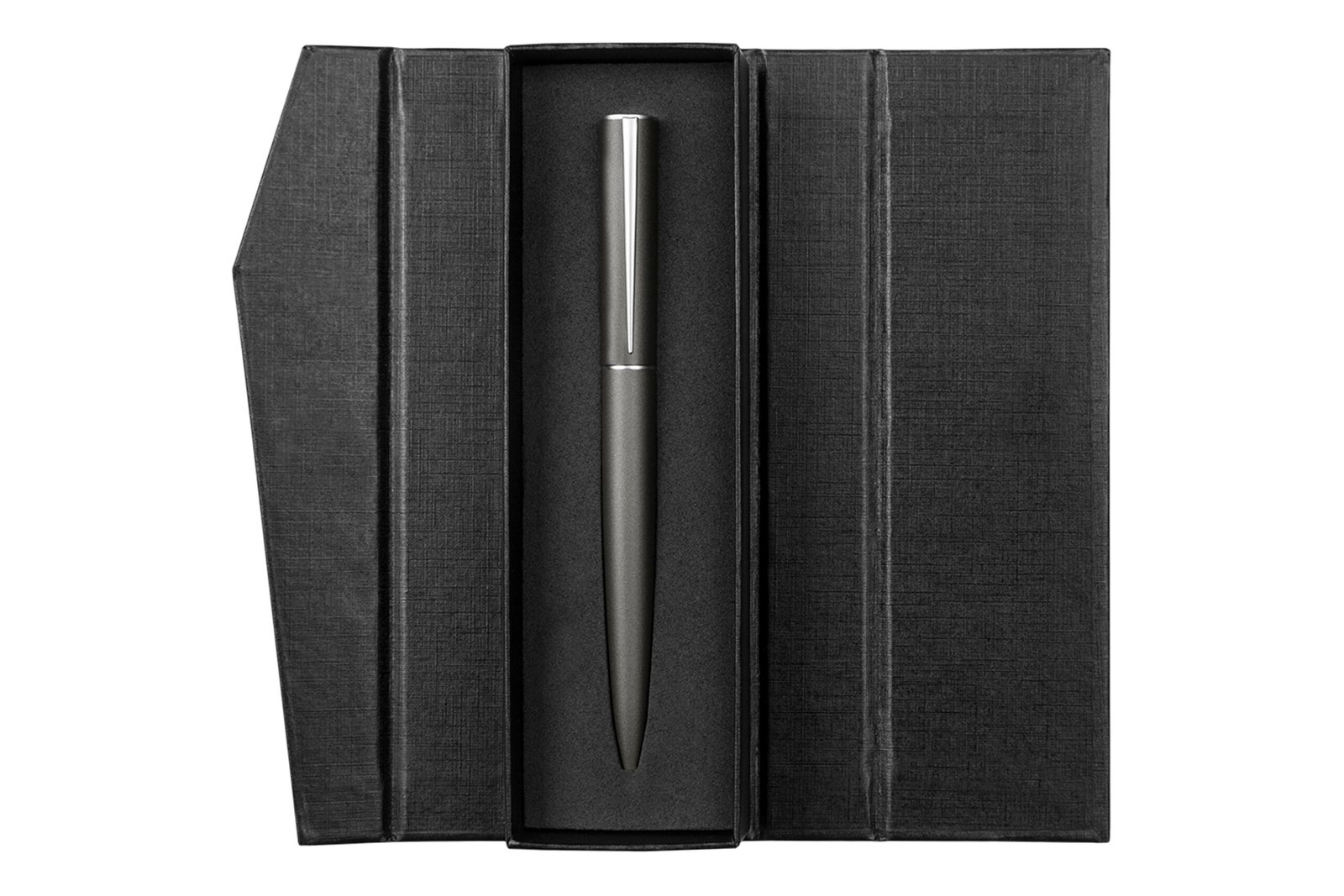 Metálico. Cuerpo color gris oscuro mate. Clip y anillo de acero. Apertura giratoria. Parte superior destapa acero. Parte inferior destapa dorado. Estuche de cartón con cierre magnético. Tinta negra. Presentación en estuche con cierre magnético.