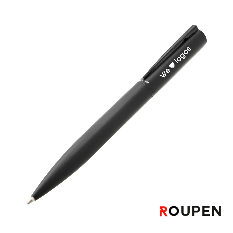 Bolígrafo de acero con detalles en latón, acabado negro mate. Dimensiones: 13,6 x 1,25 cm. Cuenta con tinta azul.