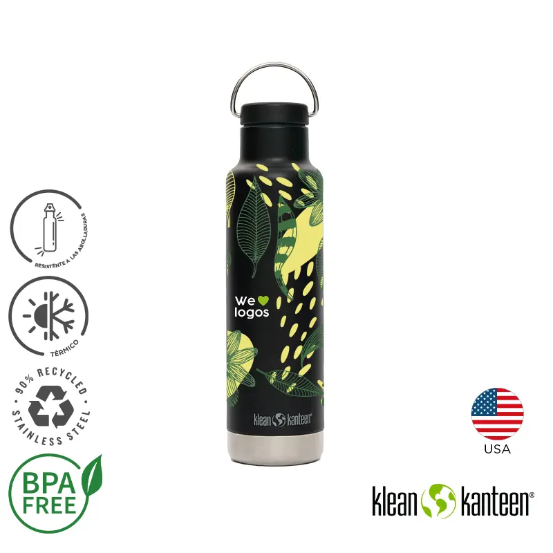 Botella térmica de 592 ml fabricada en doble pared de acero inoxidable, manteniendo las bebidas calientes durante 24 horas y frías durante 63 horas. Exterior en polvo Klean Coat, resistente a las astillas, es duradero y seguro para las personas y el planeta.