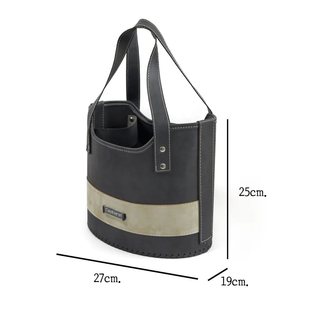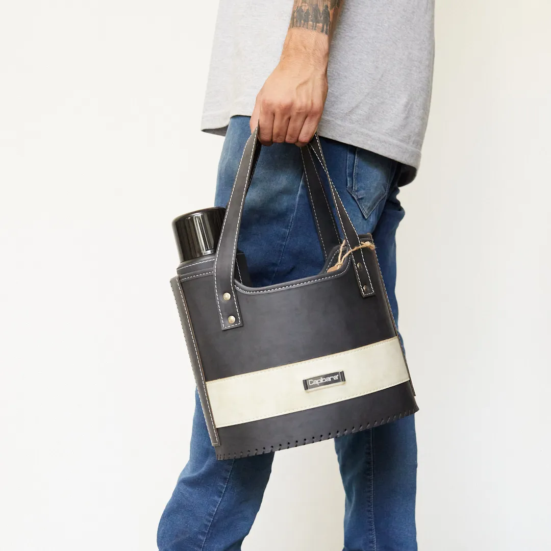 - Canasta matera de ecocuero tricapa. Posee compartimiento para calzar el termo.