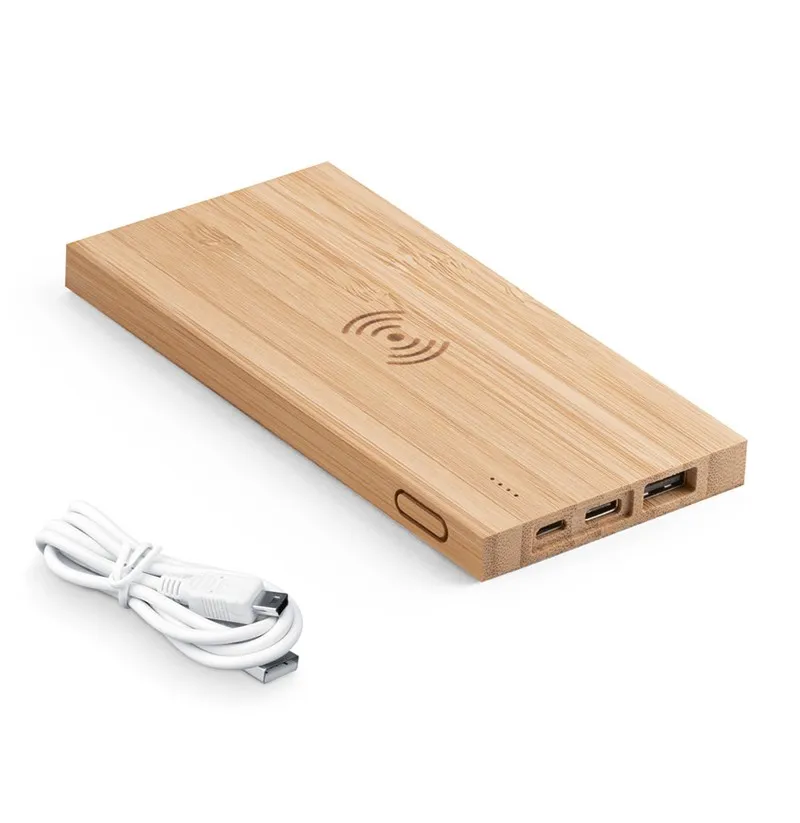 Powerbank con cargador inalámbrico de bambú. Batería portátil con capacidad de 5.000 mAh, indicador de nivel de carga, un puerto de entrada micro USB, un puerto de entrada/salida USB-C y un puerto de salida USB-A. El cargador inalámbrico tiene una potencia máxima de 5 W. Incluye un cable de carga USB-C. Compatible con dispositivos móviles con tecnología de carga inalámbrica. Se entrega en una caja de regalo de papel kraft. Como el producto está fabricado con materiales naturales, el color puede variar entre unos y otros productos. Tamaño: 145 x 75 x 15 mm