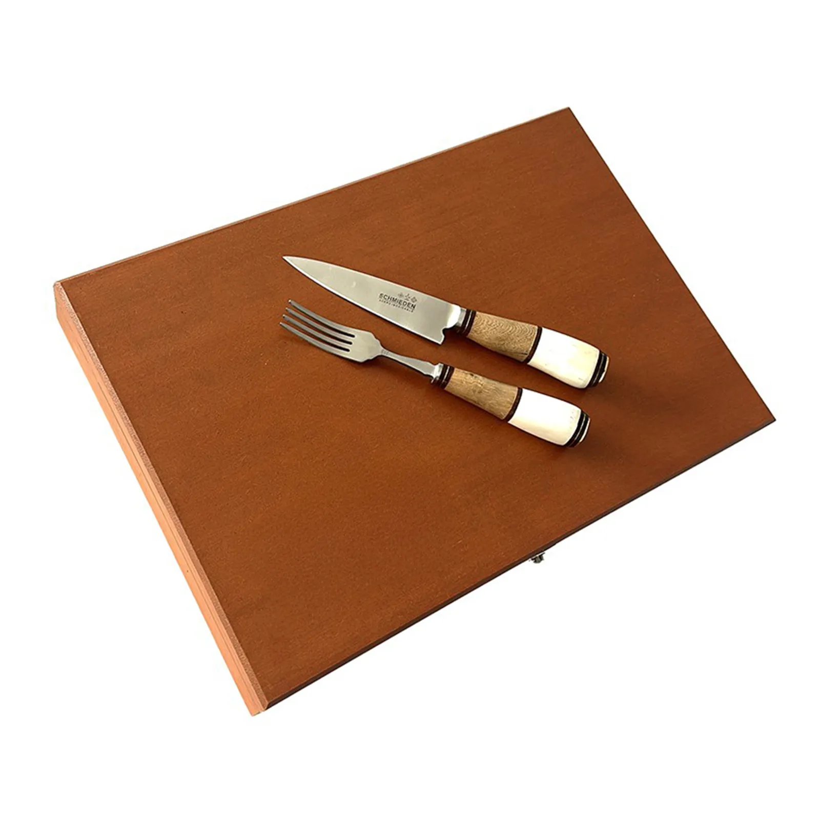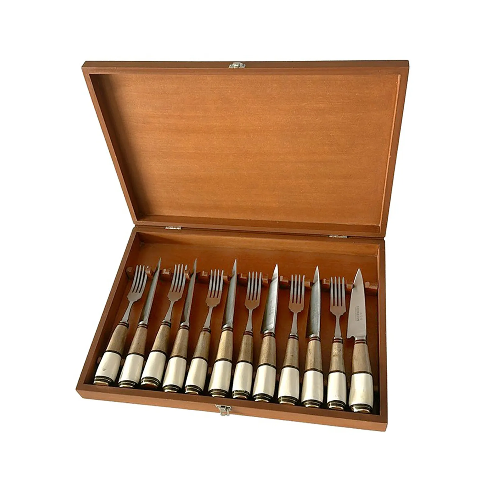 Cubiertos artesanales calidad premium. 6 juegos de cuchillo y tenedor de acero inoxidable marca Schmieden, con cabo combinado en hueso y madera autóctona seleccionada. Presentación en caja de madera lustrada.