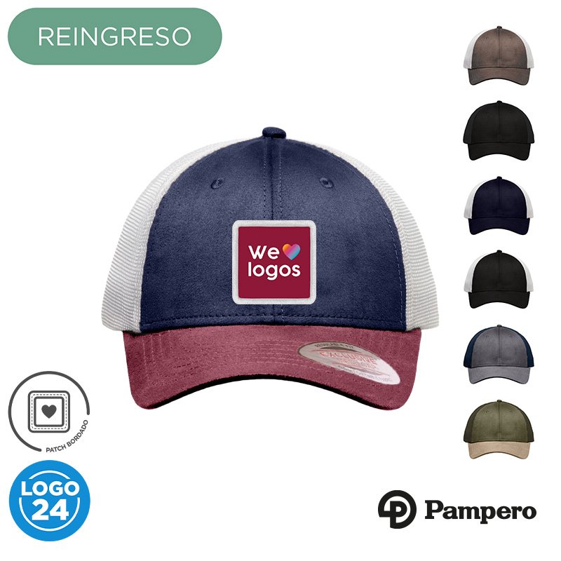 Gorro de 6 paneles de algodón símil gamuza y mesh. Cierre hebilla metálica y tira de símil gamuza. Sticker metalizado en visera. Pampero.