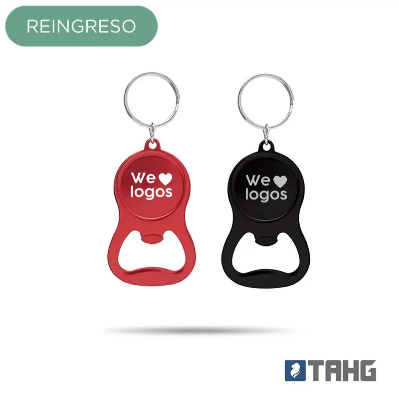 Llavero abridor tapa corona, metálico. Medidas: 4 x 6,5 x 0,3 cm. (anillo de 25 mm de diámetro). Tahg