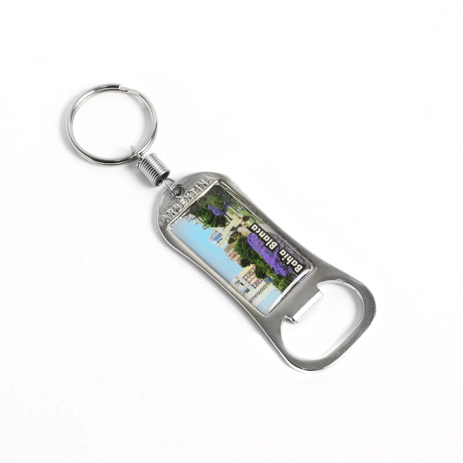Destapador de metal con resorte y argolla de 25 mm, con domes impresion full color, medida 42 x 22 mm