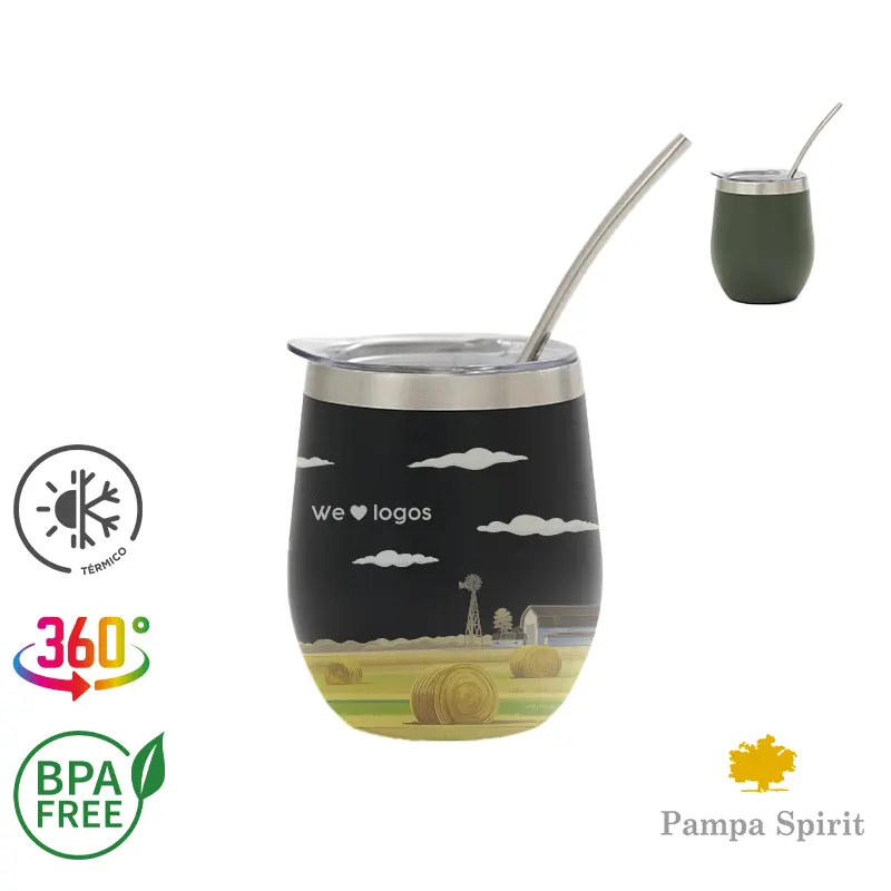 Mate confeccionado en doble pared de acero inoxidable 304. Cuenta con tapa antiderrame y bombilla de acero. Capacidad: 220 ml.