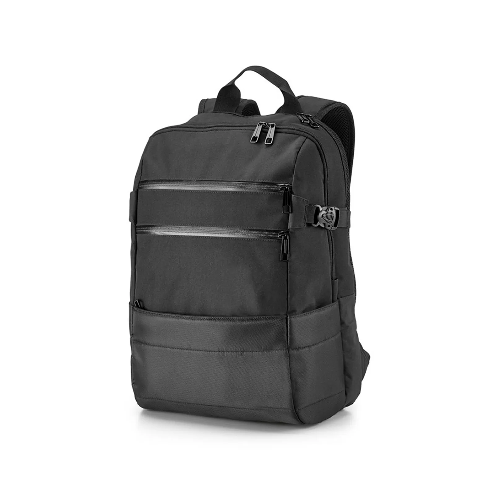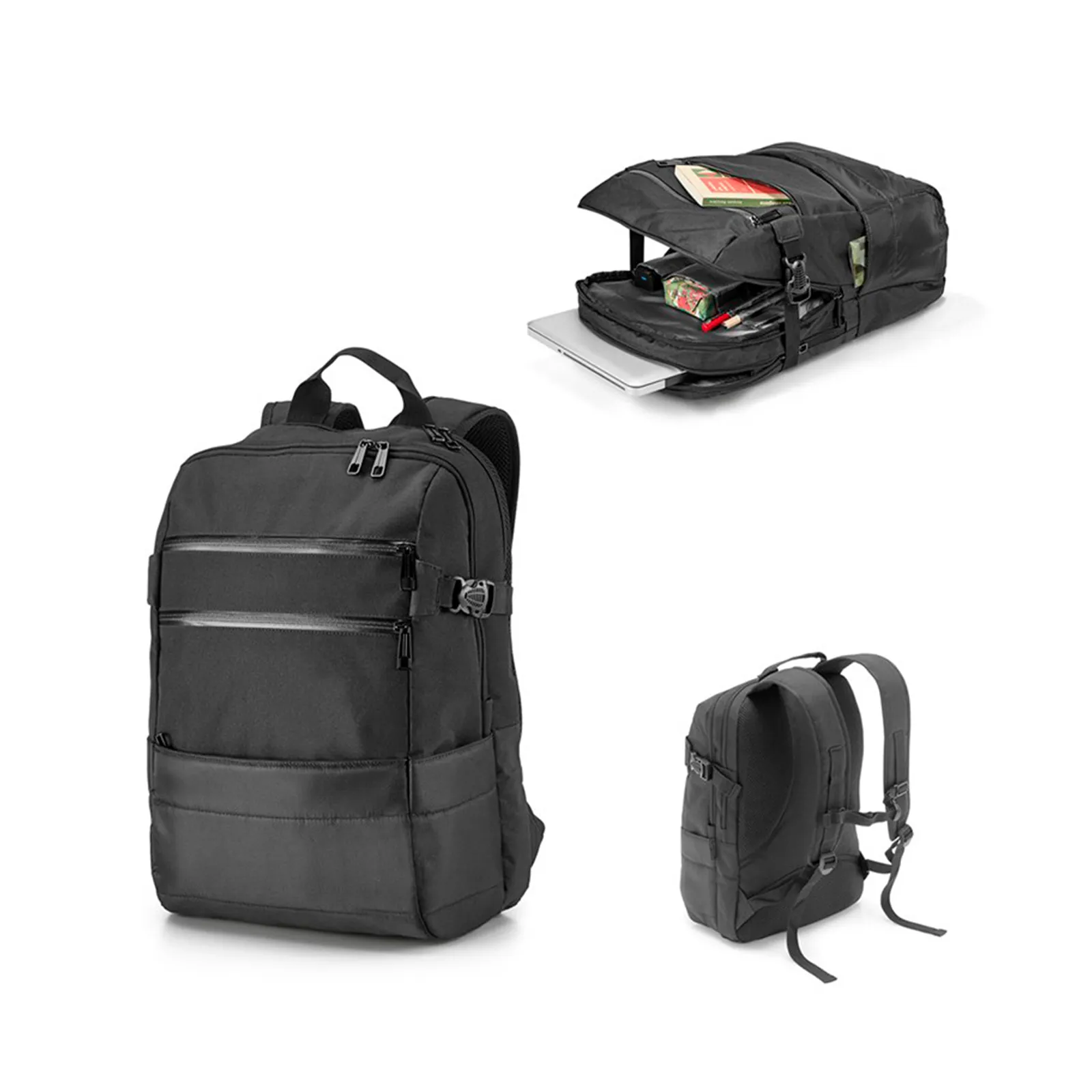 Mochila portanotebook fabricada en jacquard 840D y poliéster 300D. Dispone de 2 compartimentos, el trasero va forrado y acolchado, con 2 separaciones acolchadas para ordenadorde 15.6” y tablet 10.5”. El compartimento frontal va forrado, con varios bolsillos interiores. Incluye 3 bolsillos frontales y 2 bolsillos laterales. Parte trasera con sistema de apoyo acolchado para la espalda y asas también acolchadas. Capacidad hasta 25 L
