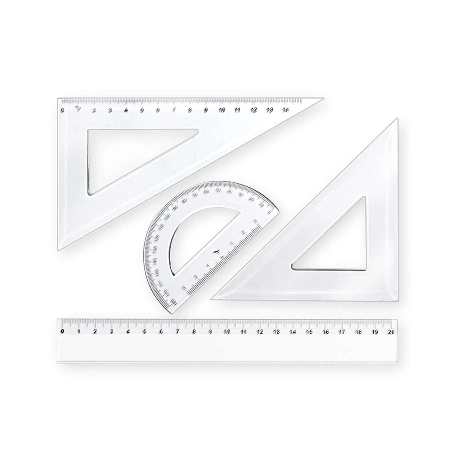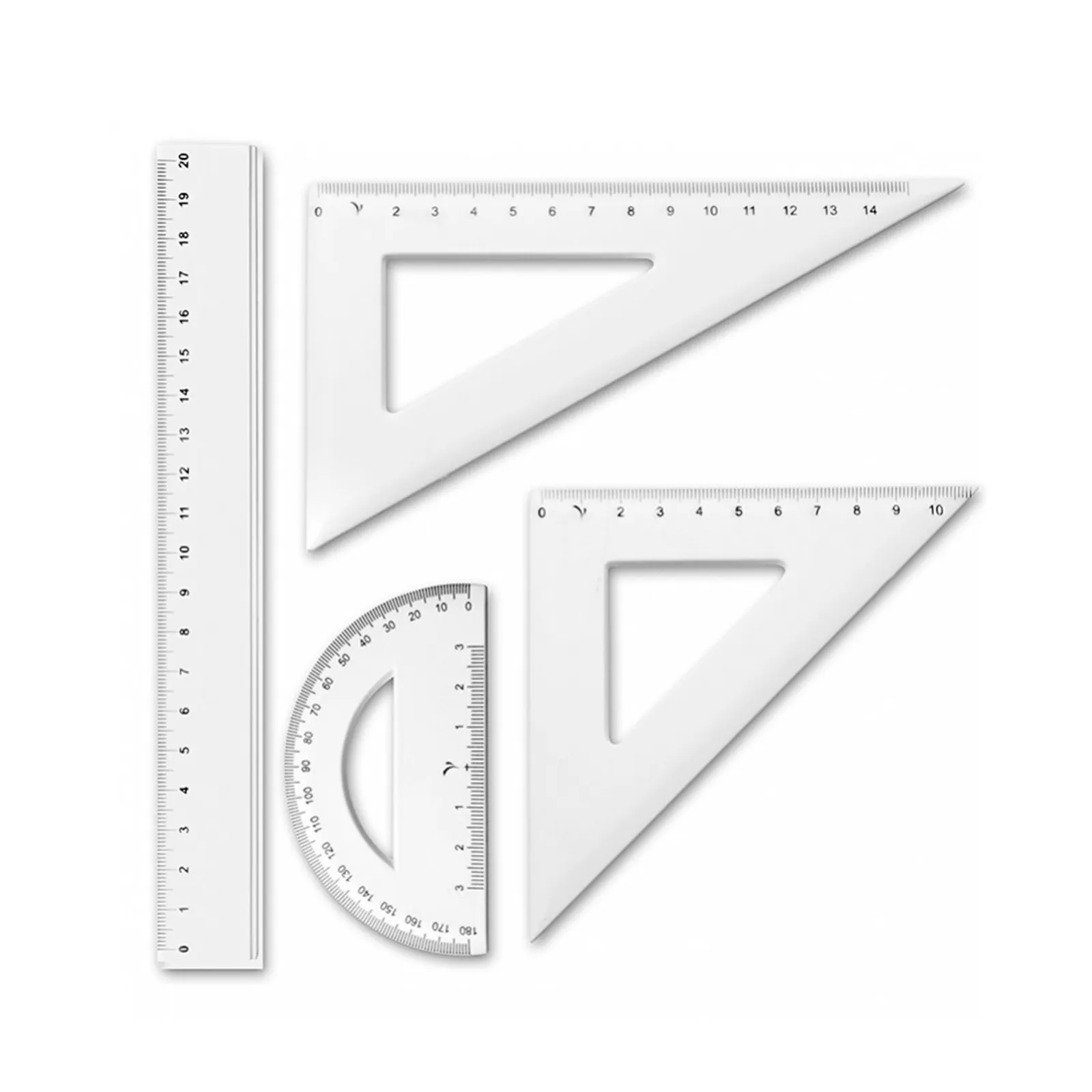 Set Escolar – Regla de 20 cm. – Ecuadra de 60º y 45º – Transportador. La impresión se realiza a 1 color en cada pieza.